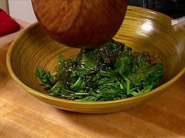 Add greens, soy sauce, vinegar, sweetener, oil, and salt; sauté until thoroughly heated.