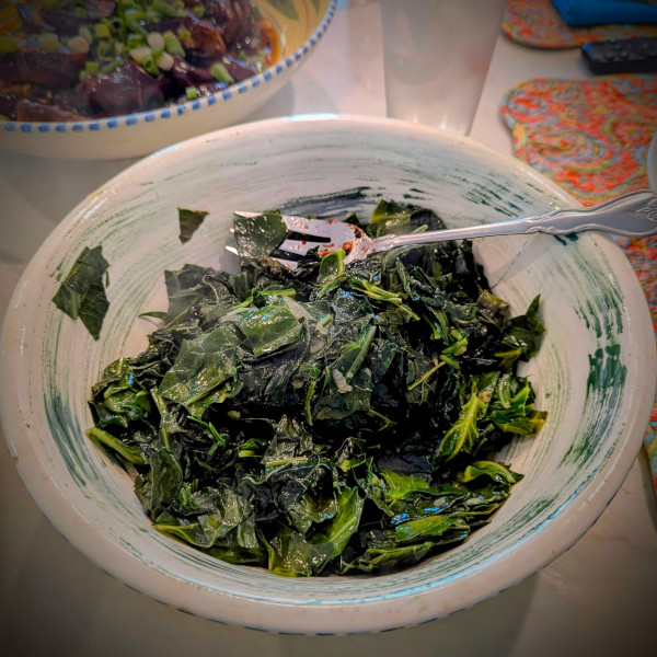 - In a large pot place the bacon grease, shallots and greens. Sprinkle with sweetener and salt.