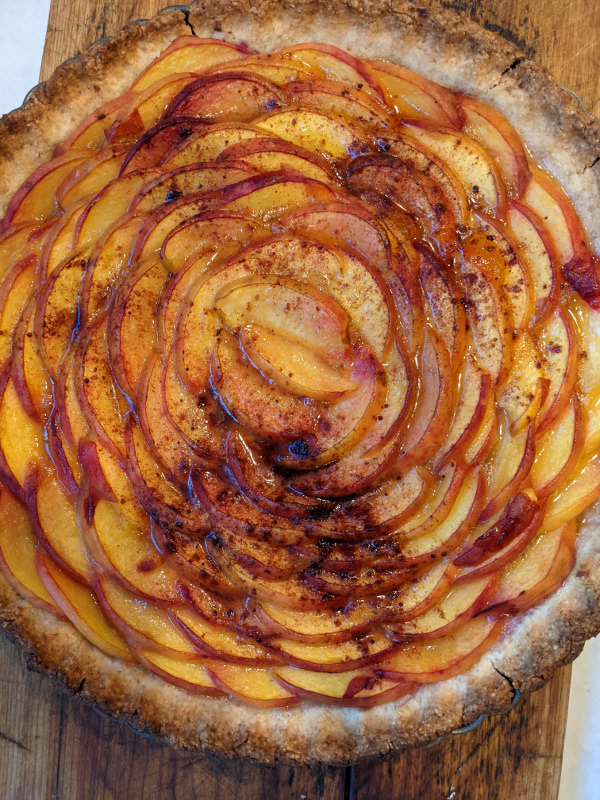 - Bake tart for 25 to 30 minutes until the preserves look thick and start bubbling around the peaches.