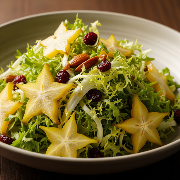 - For the dressing mix all the ingredients and pour over the frisee and carambola. Add the cranberries and almonds just before serving,