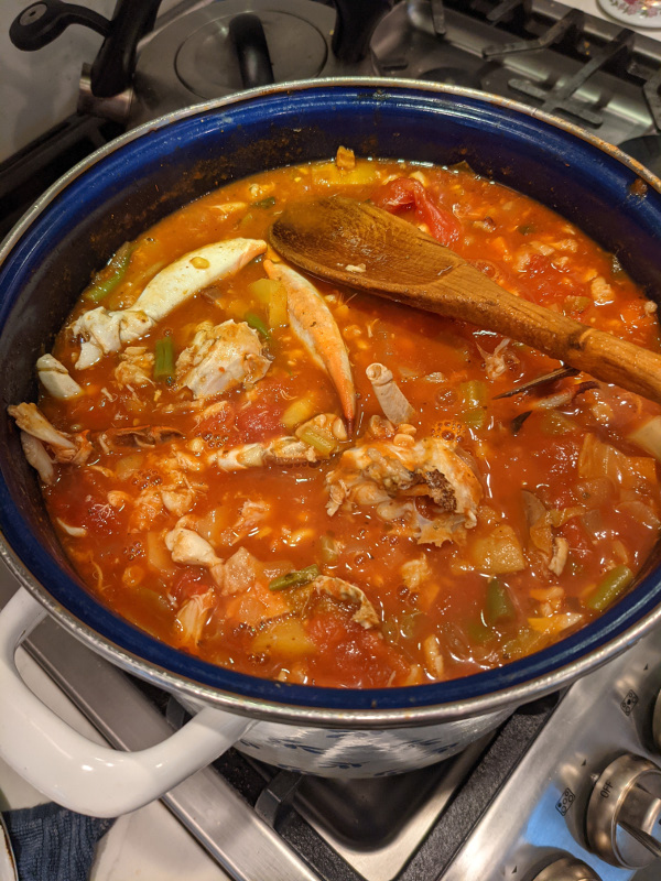 Cook simmering on lo to medium until veggies are tender. Continue to taste and add more Old Bay, salt and pepper until it is to your liking.