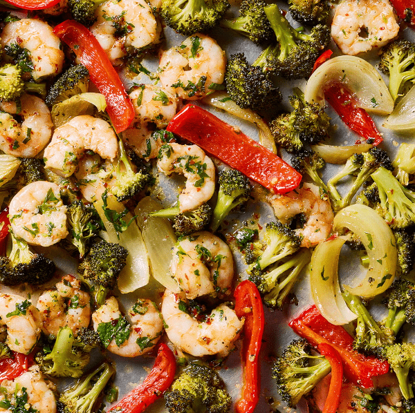 3 Pour shrimp and marinade over roasted vegetables and toss together. Spread out in a single layer and roast again until shrimp is pink and lightly toasted, 5 minutes. Serve immediately.
