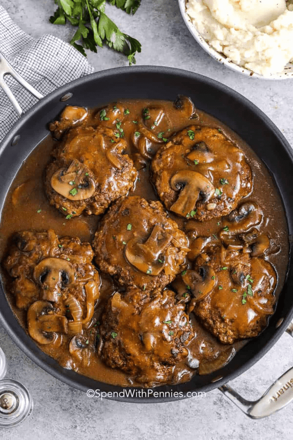 - Add a sprinkle of salt and pepper and more broth if needed for thinning. Then return the patties to the gravy. Spoon the gravy over the top and let them simmer and heat until patties are fully cooked to desired doneness 10 to 20 minutes.