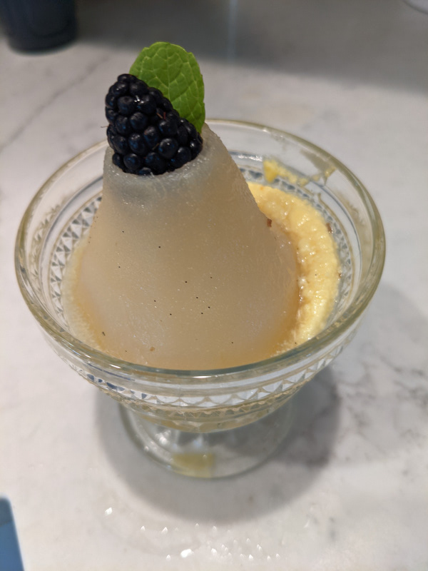 - Place a vanilla sauce into your serving dish. (I used pudding dishes). Top with a cooled pear. Refrigerate for at least 2 hours.